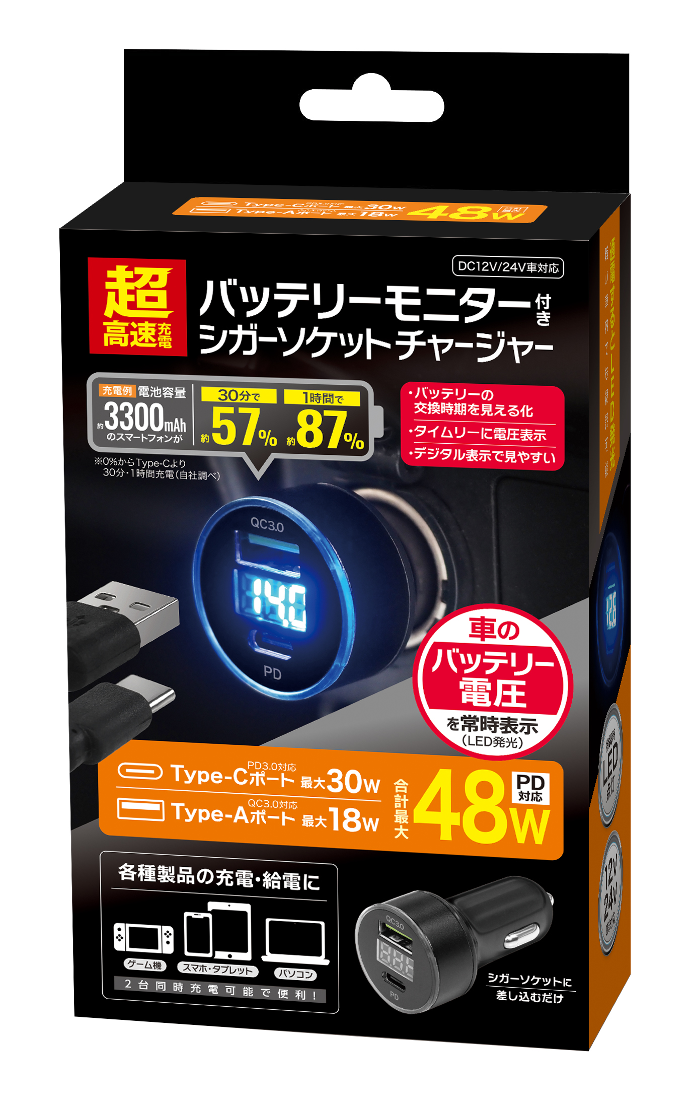 超高速充電 バッテリーモニター付きシガーソケットチャージャー